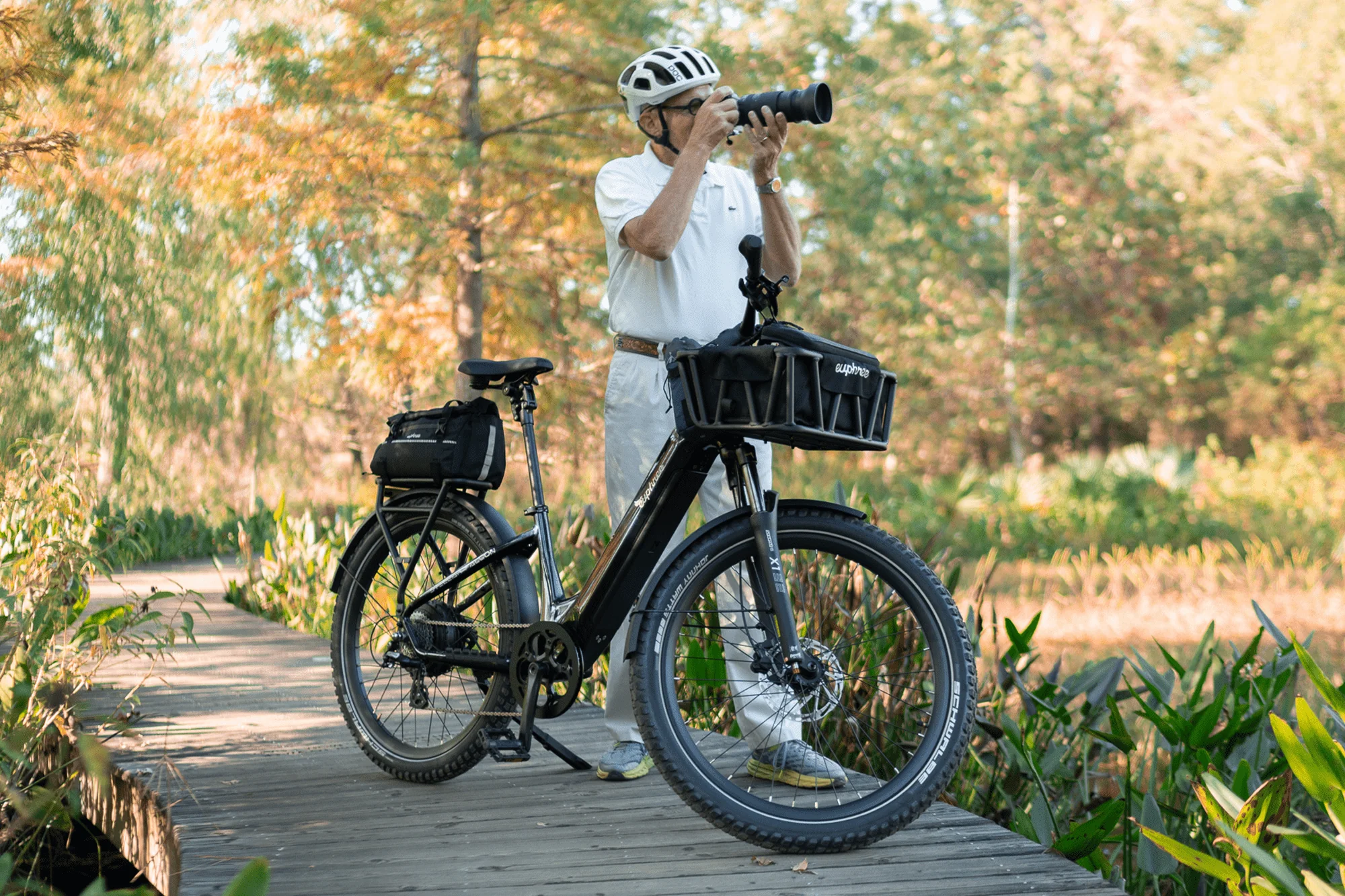 Comfort is a priority on the Falcon. An SR Suntour XCM 32 Air fork with 110mm of travel and an NCX suspension seatpost absorb bumps and rough pavement, while the wide Velo comfort saddle and upright handlebars reduce strain on your back and wrists. Schwalbe Johnny Watts 27.5” × 2.8” tires provide grip and stability on both pavement and light gravel, backed by double-walled rims and heavy-duty spokes rated for a 350 lb payload.