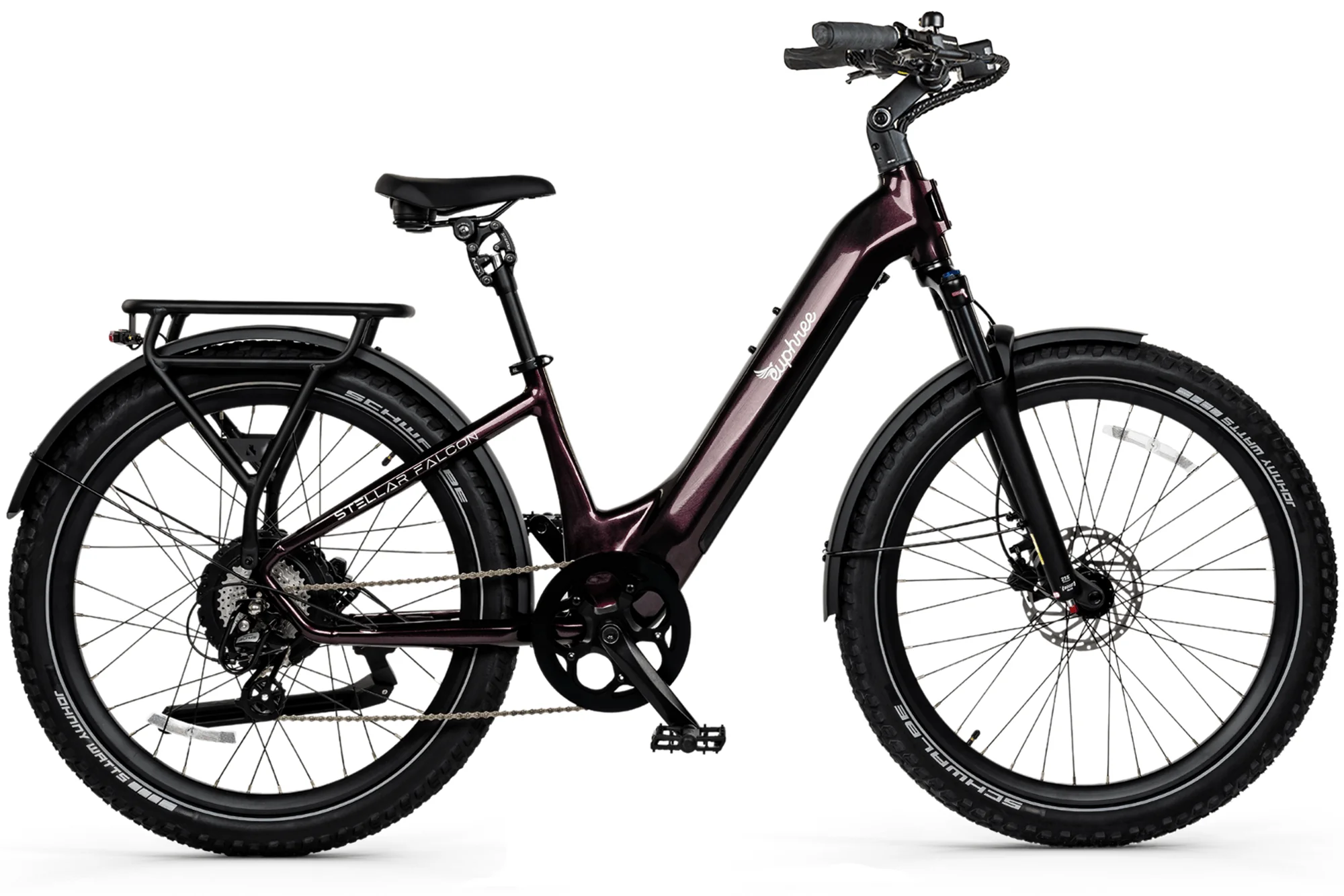 Stopping power is delivered by Tektro E350 hydraulic disc brakes with 180mm rotors and motor cut-off levers. Shimano Altus 8-speed shifting, a KMC anti-rust chain, and an integrated rear rack (100 lb capacity) round out the Falcon’s all-purpose design. With full aluminum fenders, ergonomic locking grips, and a built-in phone mount, the Falcon Step-Thru is ready for everyday commutes, weekend cruises, or long-distance adventures.