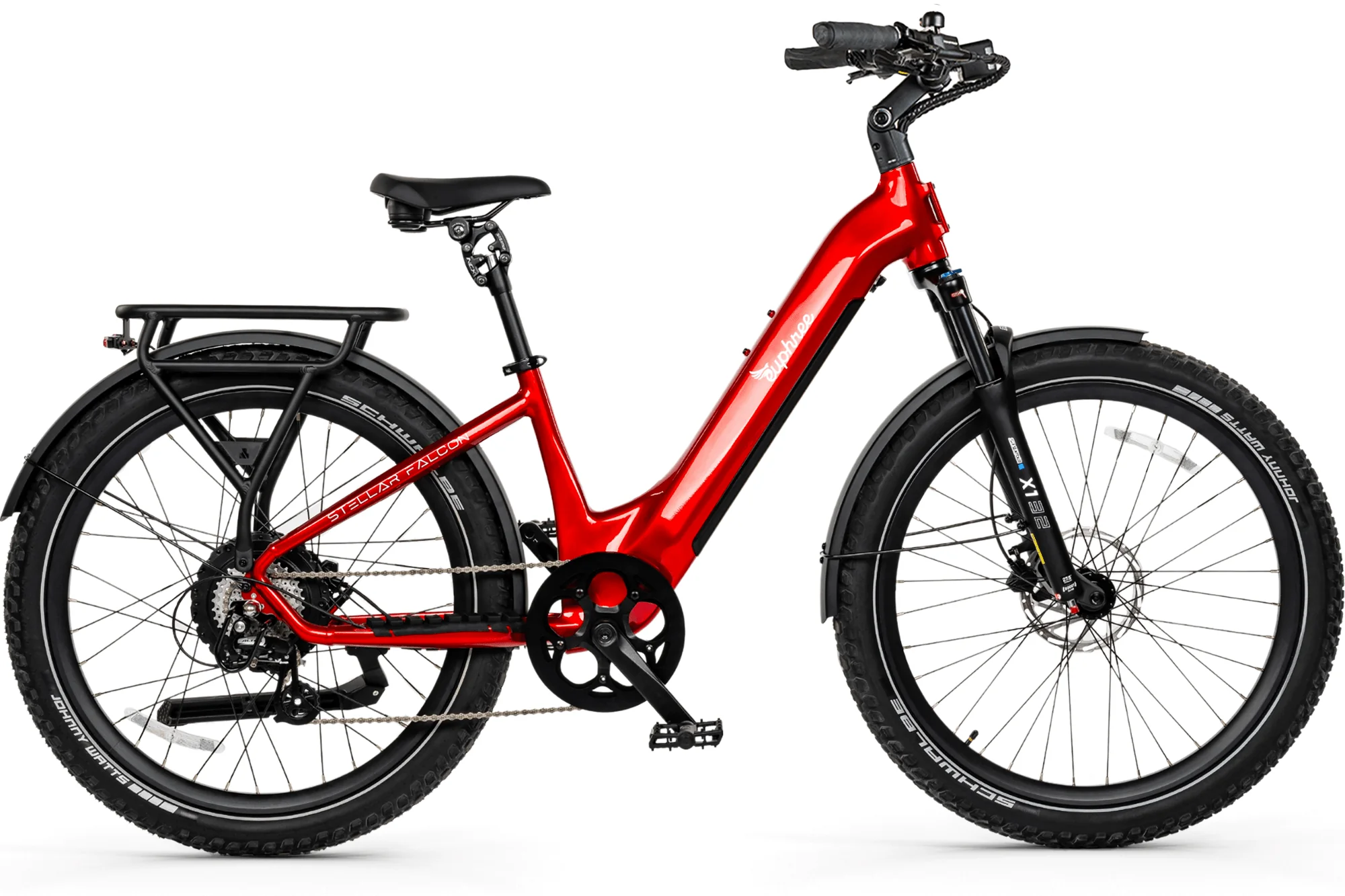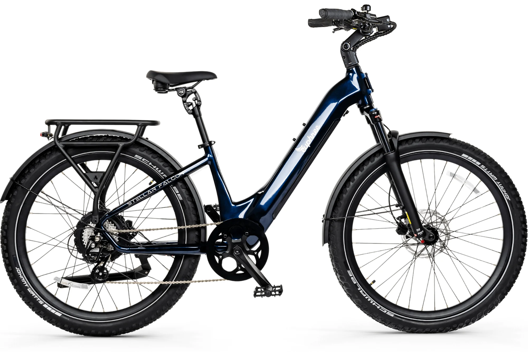 The Stellar Falcon Step-Thru combines power, comfort, and reliability into a versatile cruiser that’s equally at home on city streets or neighborhood trails. Built on a durable 6061 aluminum frame and SGS certified to meet UL 2271 (battery) and UL 2849 (system) safety standards, the Falcon is designed to keep you rolling confidently for years to come.